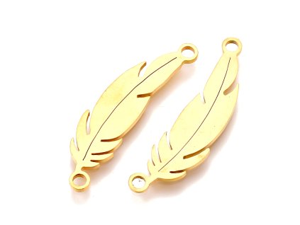 Spojovací komponent, tvar pírko, velikost 28,5x7,5x1 mm, materiál ocel 201, barva zlatá Balení 10 ks.