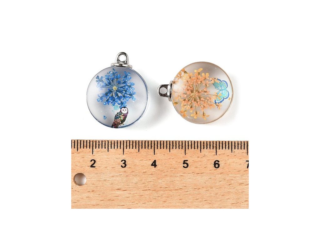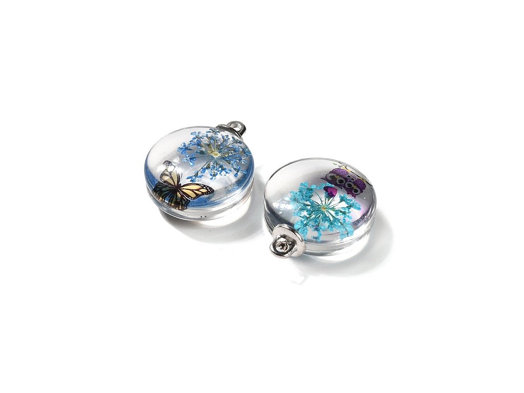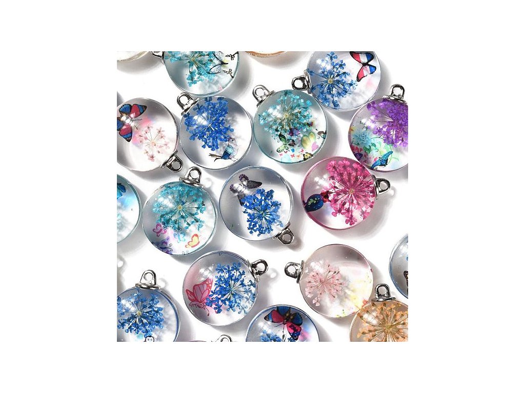 Skleněný přívěšek s kytičkou a motýlkem 24x19,5x10 mm, očko barva platina